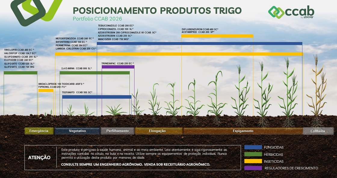 Na CCAB, atuamos para garantir que o produtor tenha acesso a soluções eficazes e acessíveis para cada fase da lavoura. Com um portfólio de defensivos, suporte técnico especializado e foco na realidade do campo, contribuímos para tornar o trigo uma cultura cada vez mais produtiva e segura.